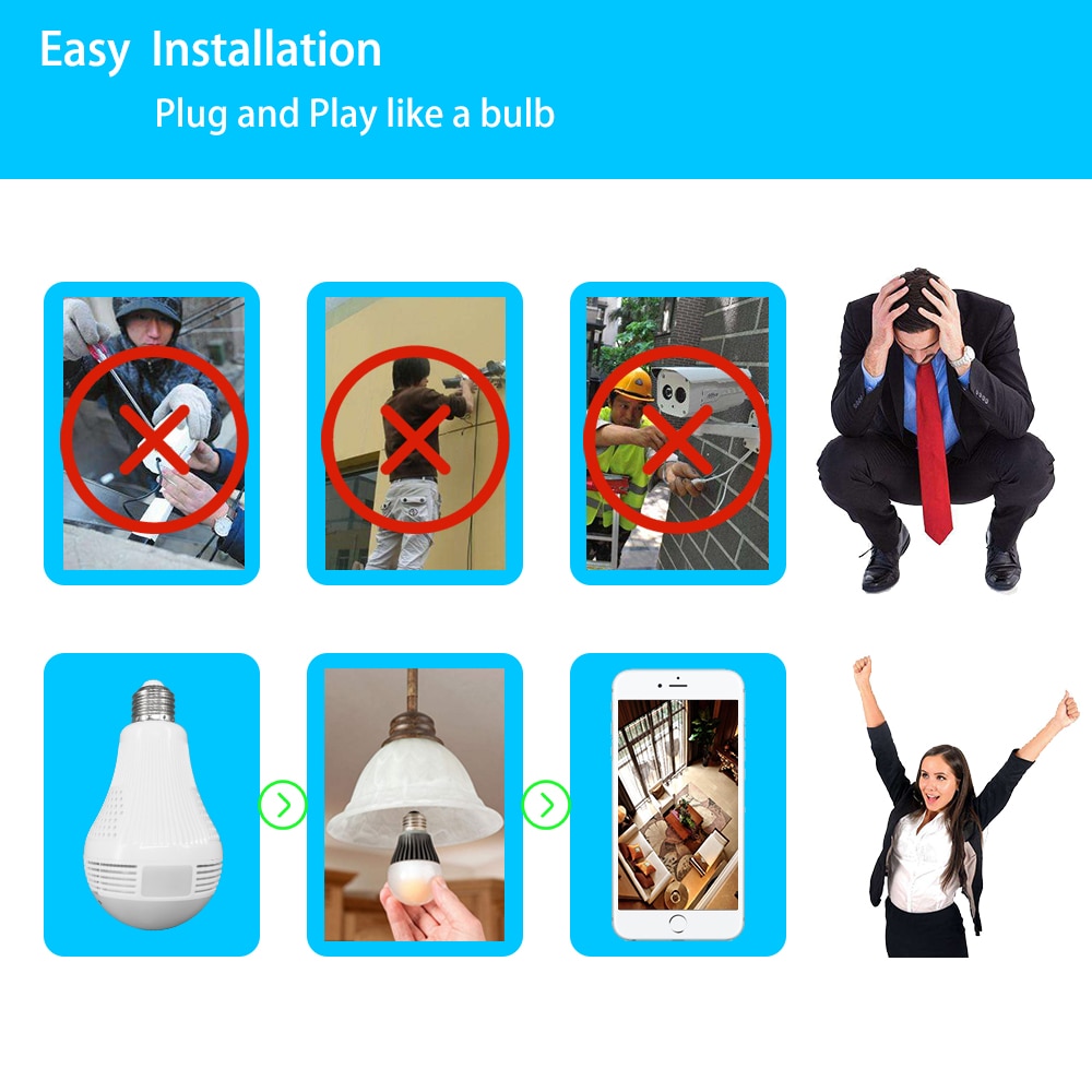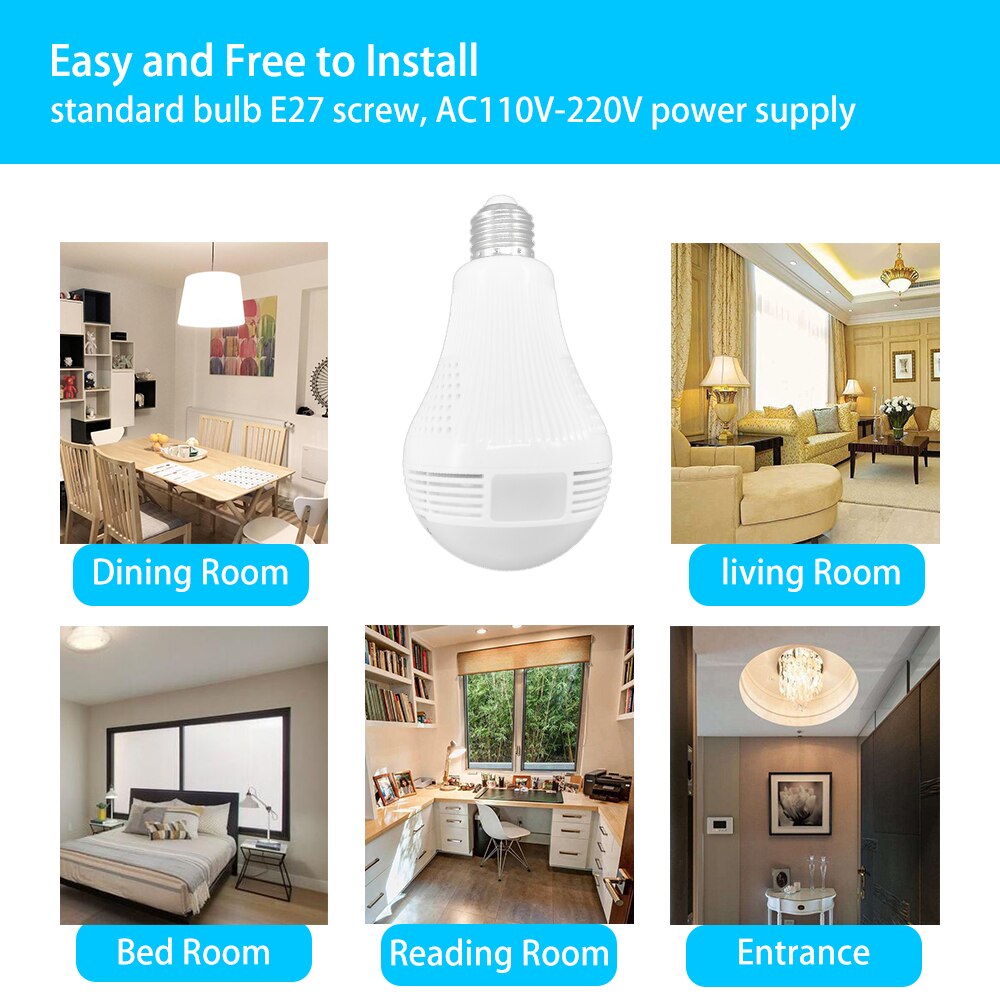 Bombilla LED espía E27 con cámara oculta 📷 gran angular de 360º, detección de movimiento y conectivilidad inalámbrica WiFi P2P con el que podrá observar en directo la imágenes desde su móvil o smartphone y así visualizar lo que sucede donde esté instalado. Puede estar conectado directamente con su smartphone 📱.