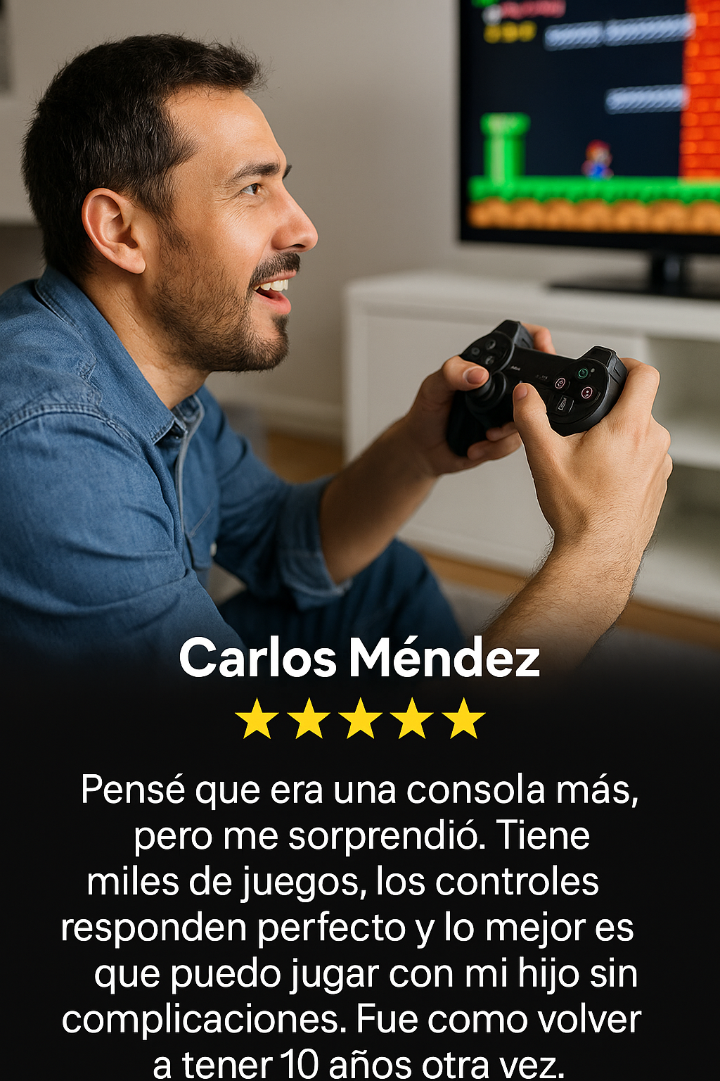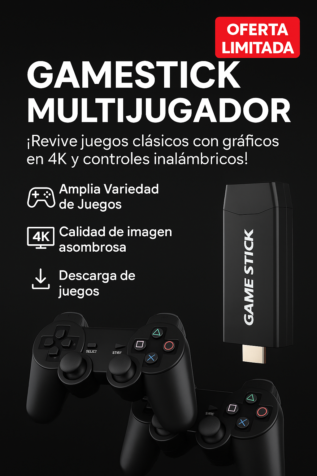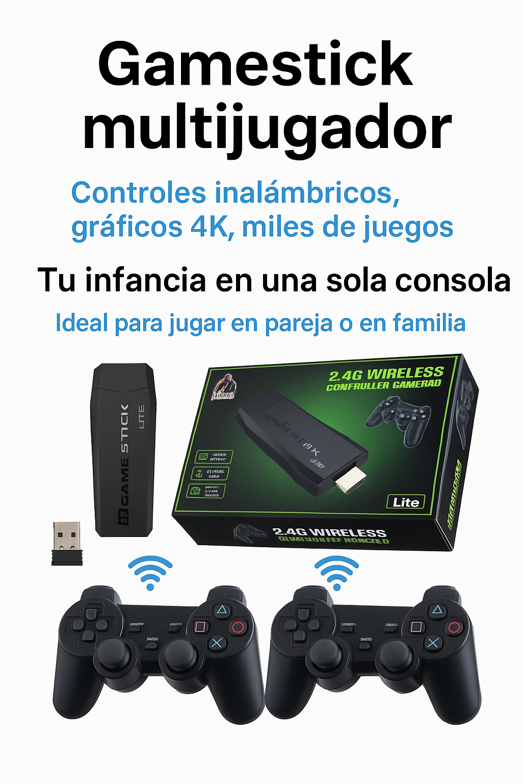 Solo conecta el Game Stick al puerto HDMI de tu televisor, alimenta el dispositivo con el cable USB incluido, y listo. ¡Plug & Play en menos de 1 minuto!
