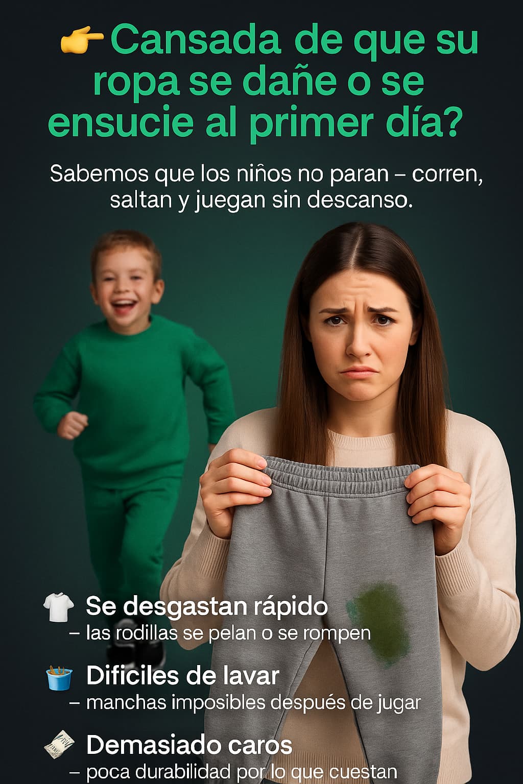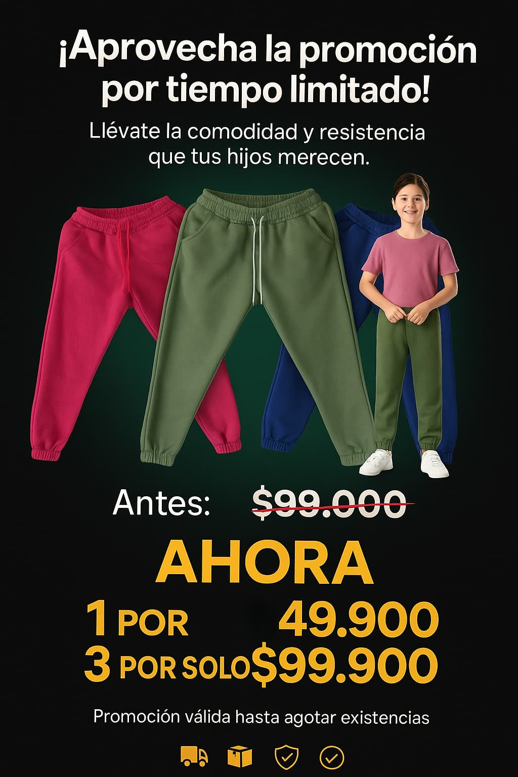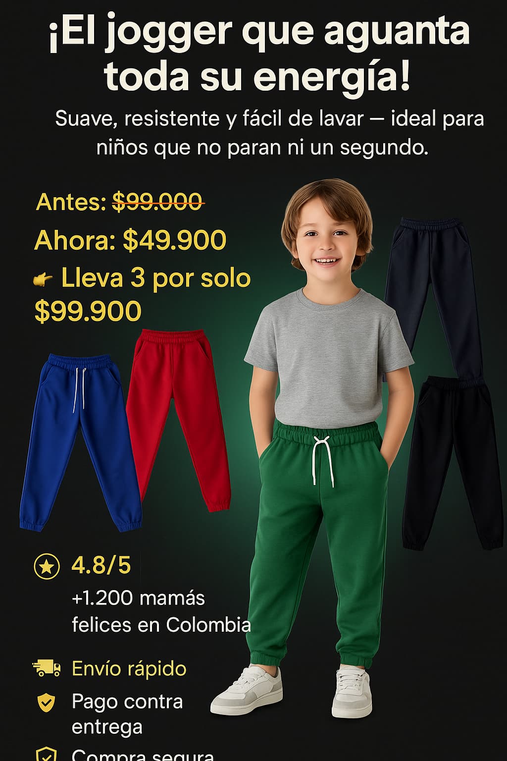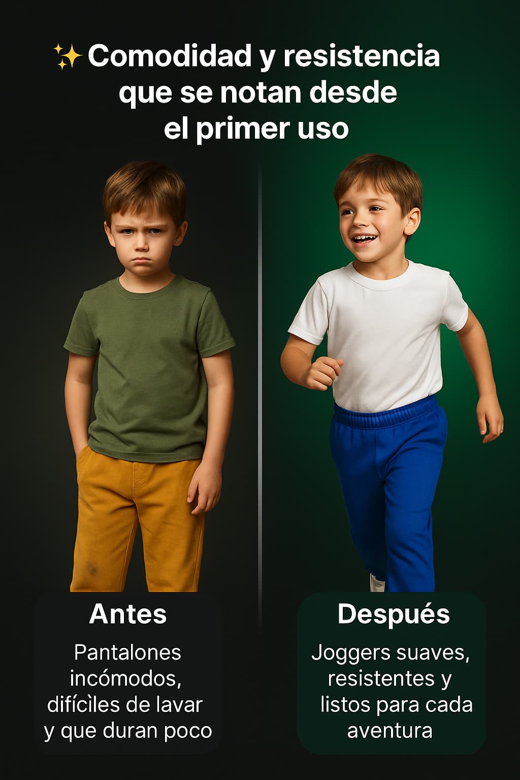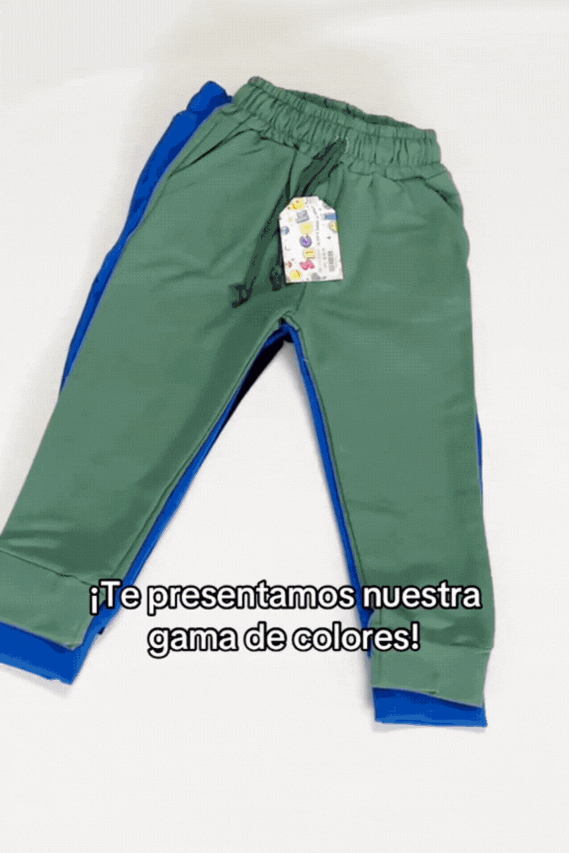 Nuestros joggers están confeccionados en una mezcla de algodón y poliéster de alta resistencia, suaves al tacto, transpirables y con costuras reforzadas para soportar el ritmo de los niños.