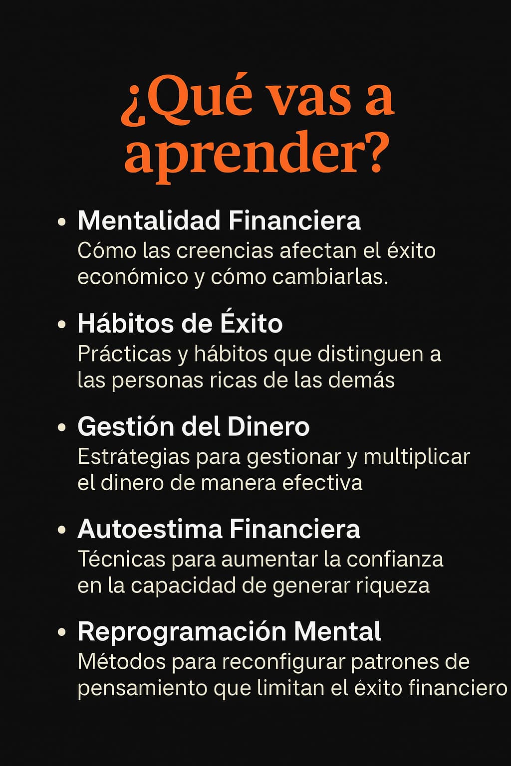 Aprenderás a identificar creencias limitantes, desarrollar hábitos de éxito, mejorar tu gestión del dinero y reprogramar tu mente para atraer abundancia.